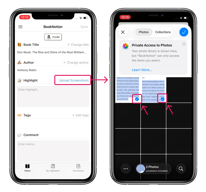 BookNotion 앱에서 스크린샷에서 가져오기를 선택하고 방금 찍은 스크린샷을 고르면, 하이라이트된 부분이 자동으로 스캔되어 입력됩니다.