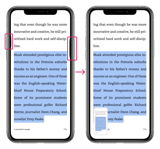 Kindle에서 하이라이트한 뒤, 측면의 두 버튼을 동시에 눌러 스크린샷을 촬영합니다.